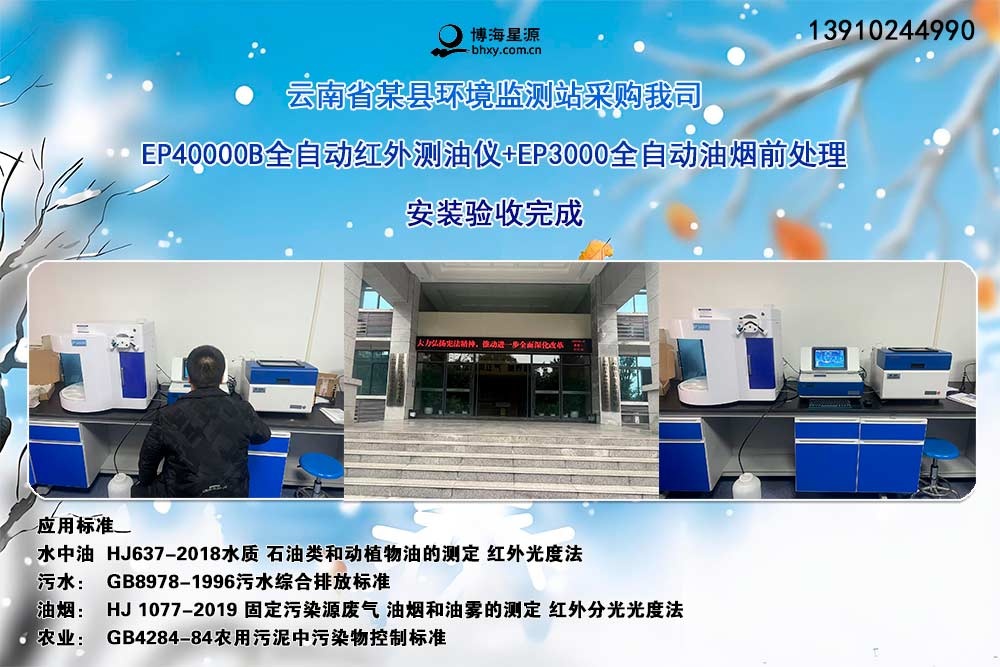 近日,我司与云南省某县环境监测站携手合作,顺利完成了博海星源EP40000B全自动红外测油仪与EP3000全自动油烟前处理设备的安装与验收工作。这一合作不仅彰显了我司产品的品质,也为当地环境监测事业注入了新的活力。