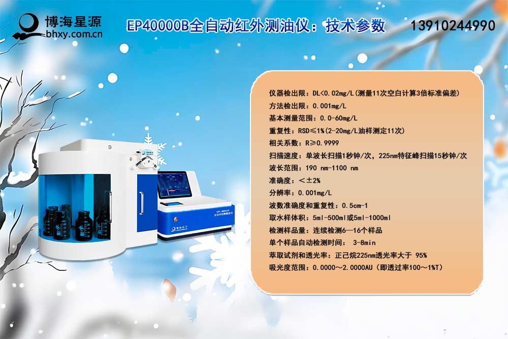 在环境监测领域,对油类污染物的精准检测至关重要。博海星源EP40000B全自动红外测油仪采用三波数红外分光光度法,能够快速、准确地测定各类样品中的油含量。其自动化程度高,操作简便,大大提高了检测效率,减少了人为误差。搭配EP3000全自动油烟前处理设备,更是为油烟监测提供了一站式解决方案。EP3000能够高效地对油烟样品进行采集、处理,确保后续检测数据的可靠性。