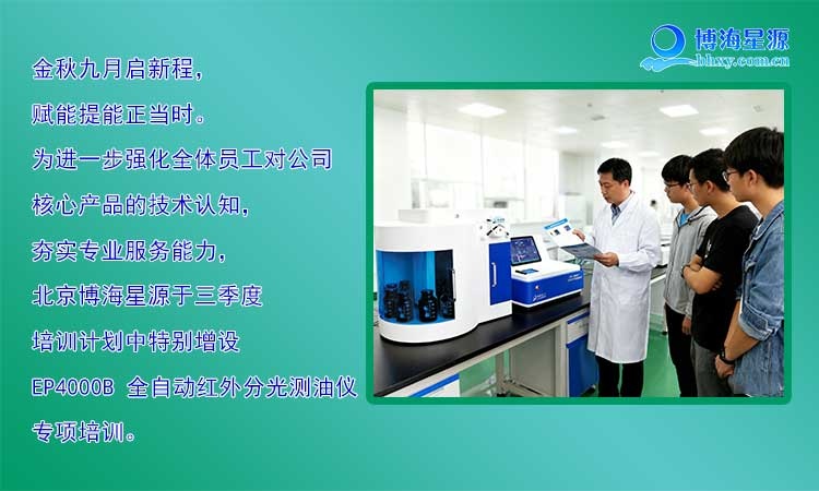 金秋九月启新程,赋能提能正当时。为进一步强化全体员工对公司核心产品的技术认知,夯实专业服务能力,北京博海星源于三季度培训计划中特别增设 EP4000B 全自动红外分光测油仪专项培训。本次培训以 “吃透产品内核、精进服务能力” 为目标,覆盖技术原理、性能优势、应用场景等全维度内容,助力各岗位员工构建系统的产品知识体系,为客户提供更专业的技术支持与服务保障。