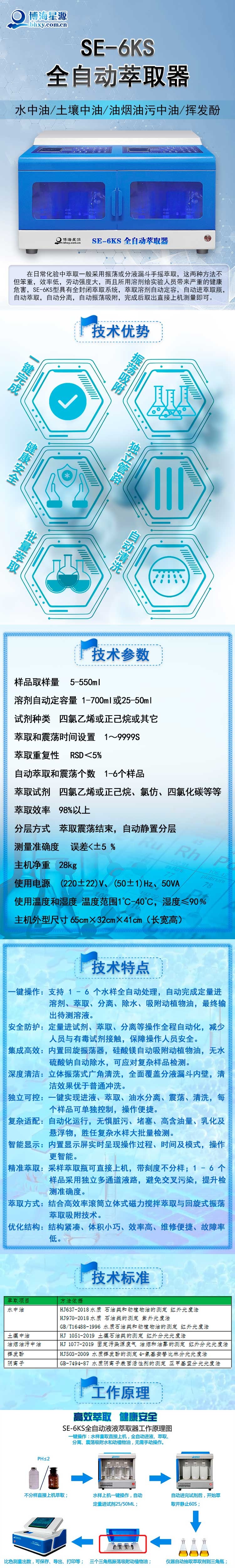 SE-6KS型全自动萃取器具有全封闭萃取系统,萃取溶剂自动定容,自动进萃取瓶,自动萃取,自动分离,自动振荡吸附隔开了有害气体对人的伤害。
