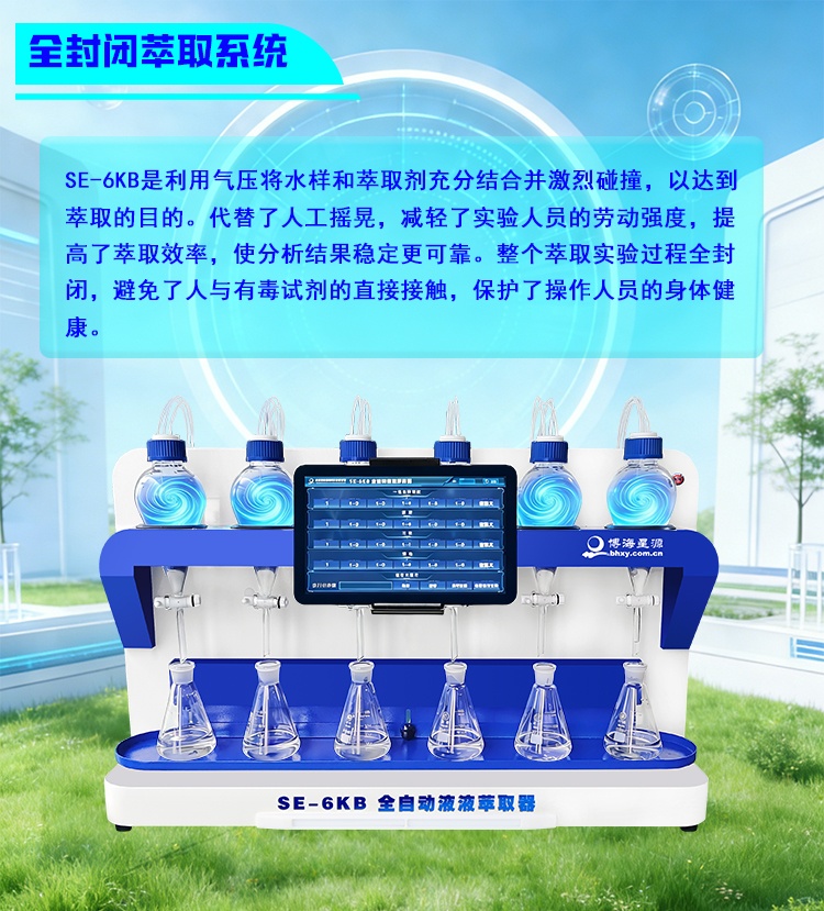 SE-6KA 型全自动液液萃取器配备全封闭萃取系统,可实现萃取溶剂自动萃取、自动分离、自动清洗,减少有害气体对人体的影响。