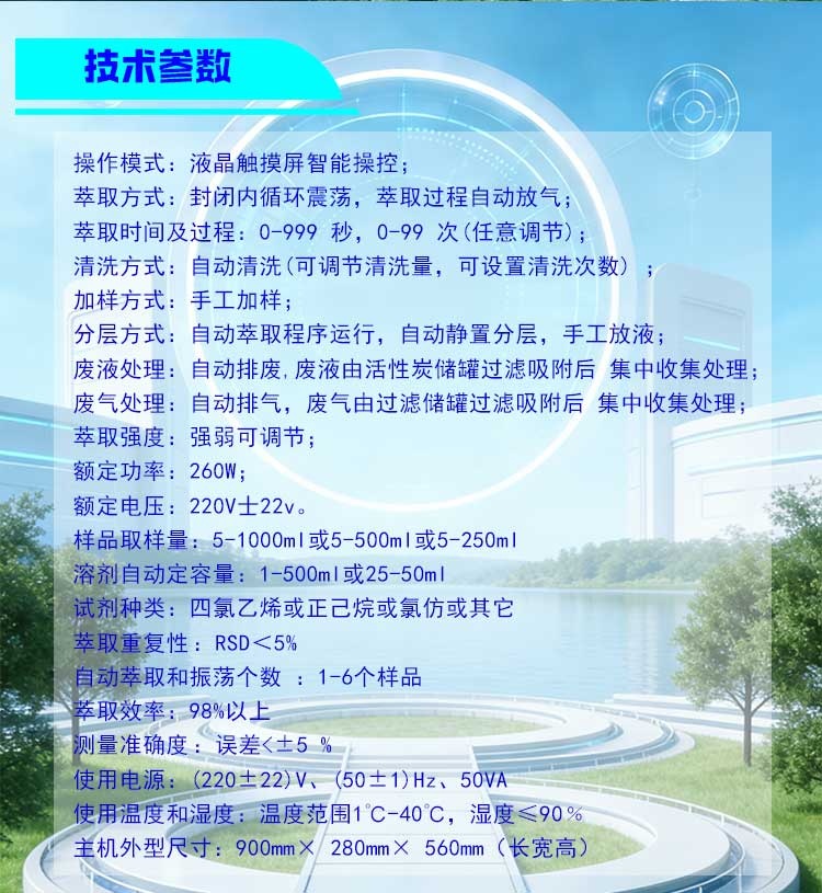 流程自动化:可自动完成萃取、静止分层、洗涤剂与蒸馏水清洗操作,后续接出溶液即可进行测量;
