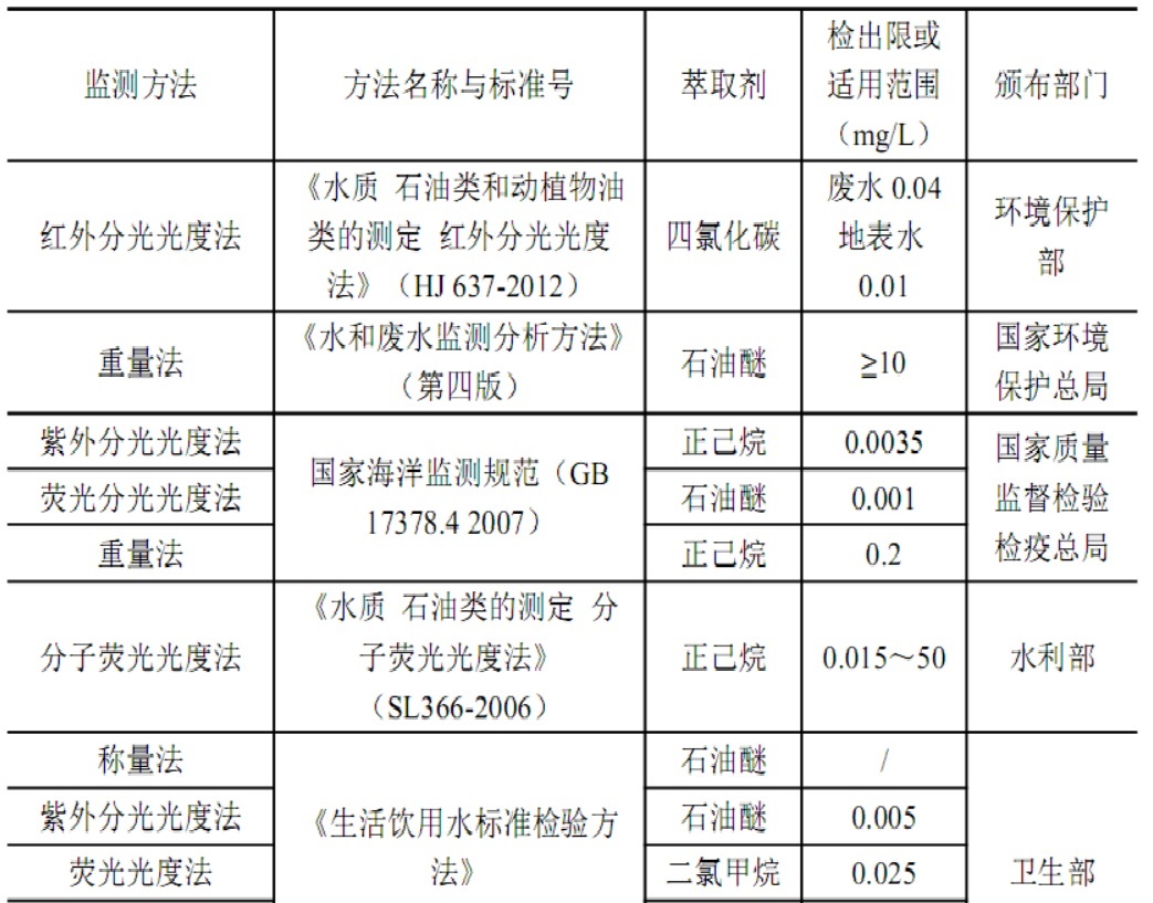 国家质量监督检验检疫总局 2007 年颁布的《国家海洋监测规范》(GB17378.4-2007)中,收录了以正己烷为萃取剂的紫外分光光度法、以石油醚为萃取剂的荧光分光光度法和以正己烷为萃取剂的重量法,上述三种方法的检出限分别为 0.0035 mg/L、0.001 mg/L、0.2mg/L。