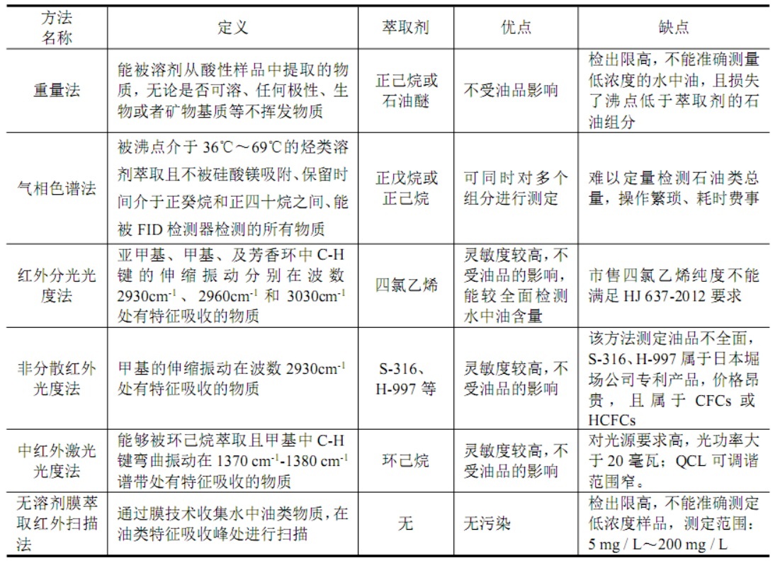 目前,国外检测水中油的方法主要有重量法、气相色谱法、红外分光光度法、非分散红外光度法、中红外激光光度法和无溶剂膜萃取红外扫描法,特点见下表。