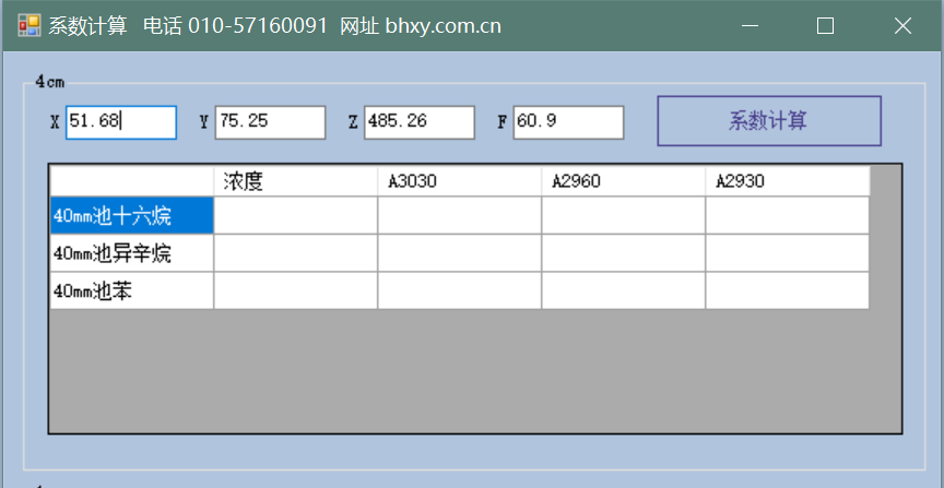 4.1 .2. 经测定校正系数X=51.68、Y=75.26、Z=485.26、F=60.9