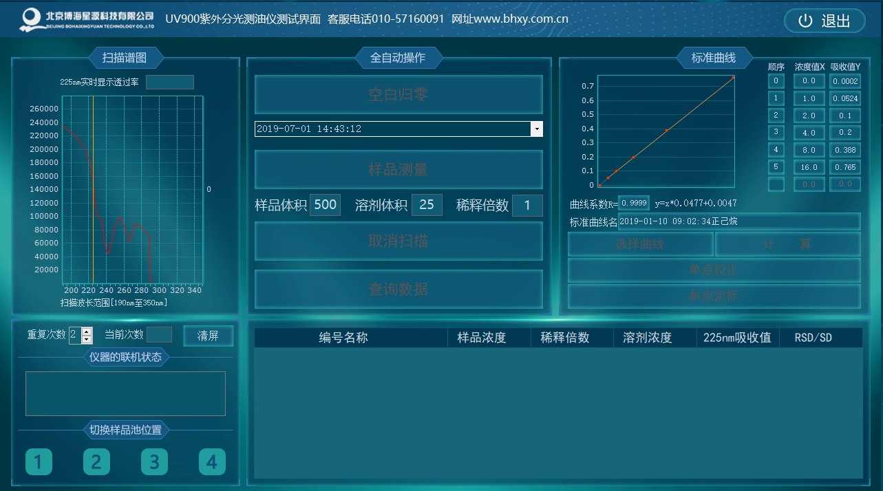 G、在完成最后一个标样测定后,点击“计算”按钮,仪器自动算出曲线相关系数、截距等参数并画出曲线;