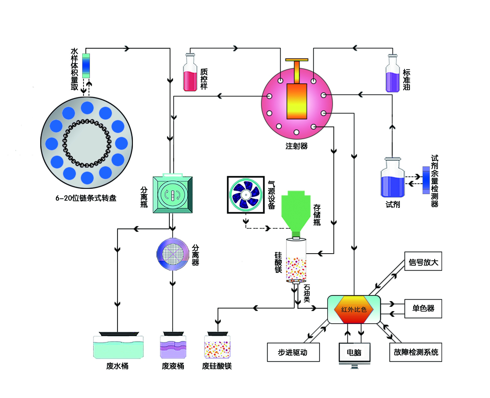 9. 无限次自动填充更换排放硅酸镁符合国标一样一换,可全自动总油石油类或动植物油检测,自动显示硅酸镁剩余量;
