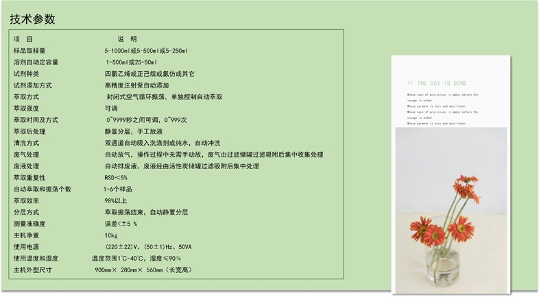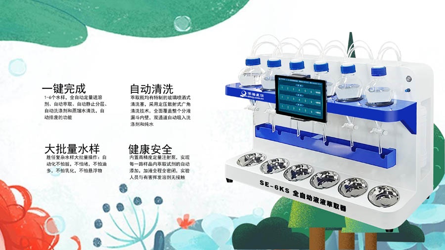 1.一键完成:1-6个水样,全自动定量进溶剂、自动萃取、自动静止分层、自动洗涤剂和蒸馏水清洗,自动排废的功能,最后接出溶液测量即可;
