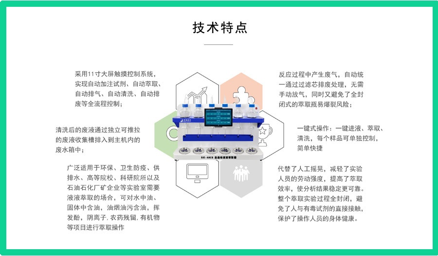 8.一键式操作:一键进液、萃取、清洗,每个样品可单独控制,简单快捷;