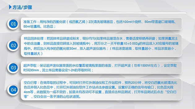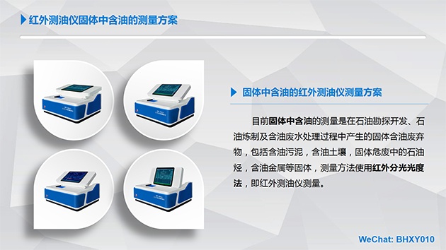 目前固体中含油的测量是在石油勘探开发、石油炼制及含油废水处理过程中产生的固体含油废弃物,包括含油污泥,含油土壤,固体危废中的石油烃,含油金属等固体,测量方法使用红外分光光度法,即红外测油仪测量。