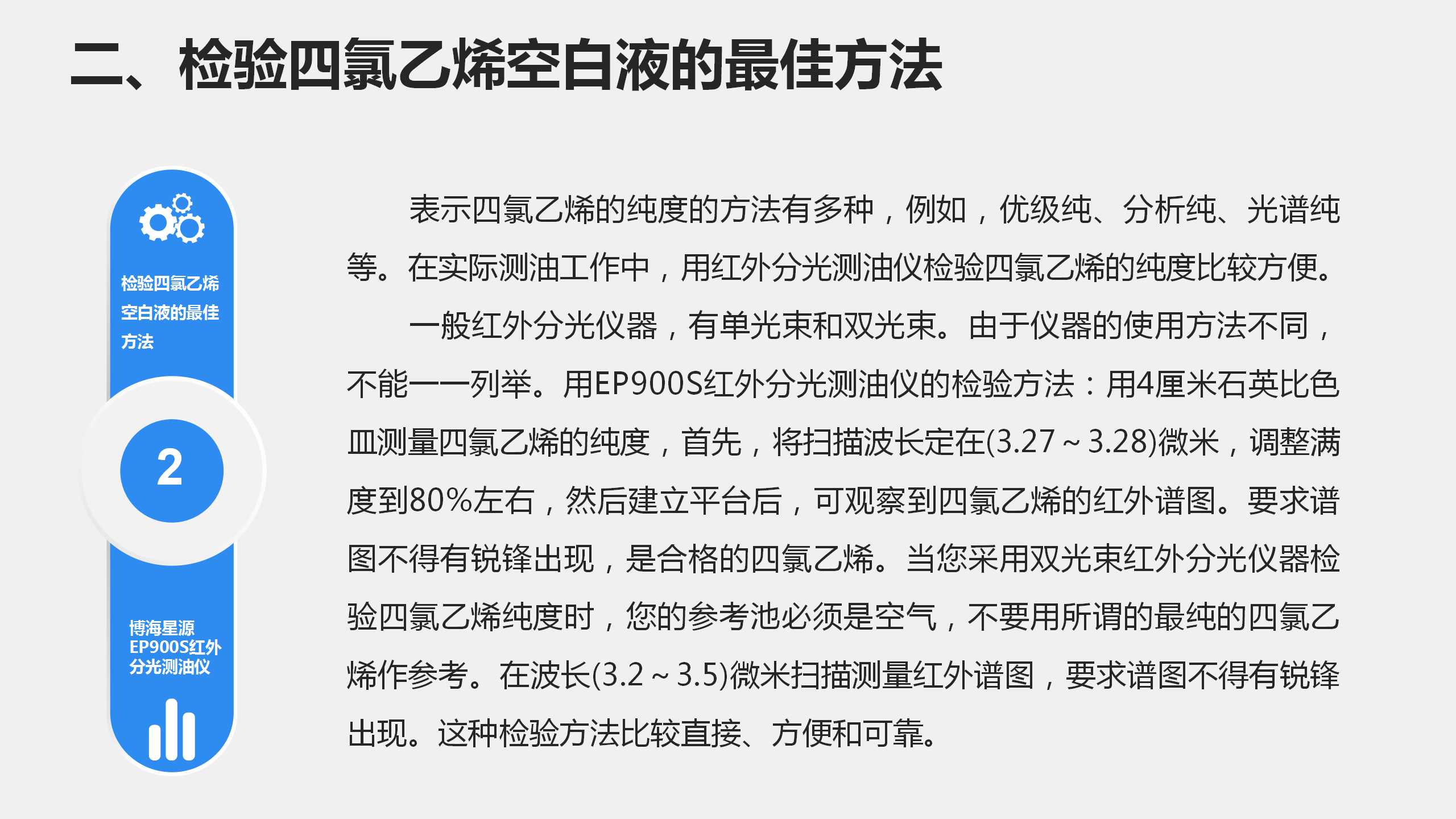 一般红外分光仪器,有单光束和双光束。由于仪器的使用方法不同,不能一一列举。用EP900S红外分光测油仪的检验方法:用4厘米石英比色皿测量四氯乙烯的纯度,首先,将扫描波长定在(3.27~3.28)微米,调整满度到80%左右,然后建立平台后,可观察到四氯乙烯的红外谱图。要求谱图不得有锐锋出现,是合格的四氯乙烯。当您采用双光束红外分光仪器检验四氯乙烯纯度时,您的参考池必须是空气,不要用所谓的最纯的四氯乙烯作参考。在波长(3.2~3.5)微米扫描测量红外谱图,要求谱图不得有锐锋出现。这种检验方法比较直接、方便和可靠。