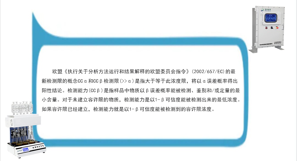 欧盟《执行关于分析方法运行和结果解释的欧盟委员会指令》(2002/657/EC)的最新检测限的概念CCα和CCβ检测限(>>α)是指大于等于此浓度限,将以α误差概率得出阳性结论。检测能力(CCβ)是指样品中物质以β误差概率能被检测、鉴别和/或定量的最小含量。对于未建立容许限的物质,检测能力是以1-β可信度能被检测出来的最低浓度。如果容许限已经建立,检测能力就是以1-β可信度能被检测到的容许限浓度。