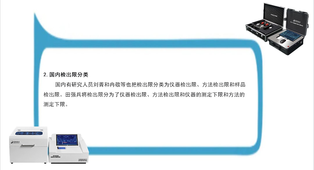 国内有研究人员刘菁和冉敬等也把检出限分类为仪器检出限、方法检出限和样品检出限。田强兵将检出限分为了仪器检出限、方法检出限和仪器的测定下限和方法的测定下限。