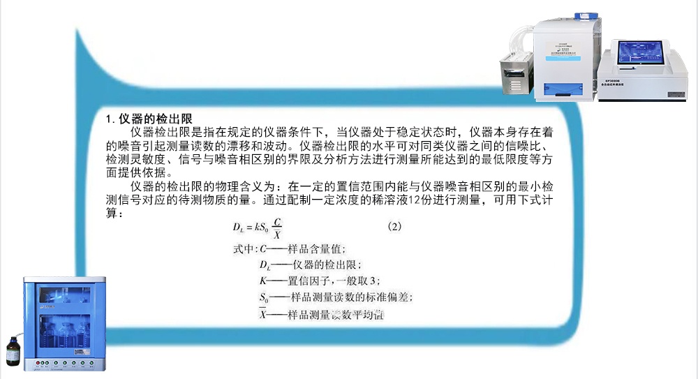 仪器检出限是指在规定的仪器条件下,当仪器处于稳定状态时,仪器本身存在着的噪音引起测量读数的漂移和波动。仪器检出限的水平可对同类仪器之间的信噪比、检测灵敏度、信号与噪音相区别的界限及分析方法进行测量所能达到的最低限度等方面提供依据。