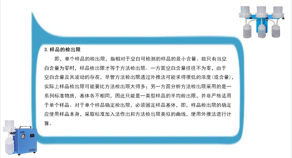 即,单个样品的检出限,指相对于空白可检测的样品的最小含量。故只有当空白含量为零时,样品检出限才等于方法检出限。一方面空白含量往往不为零,由于空白含量及其波动的存在,尽管方法检出限通过外推法可能求得很低的浓度(或含量),实际上样品检出限可能要比方法检出限大得多;另一方面分析方法检出限采用的是一系列标准物质,基体各不相同,因此只能是一类型样品的平均检出限,并非严格适用于单个样品。对于单个样品确定检出限,必须固定样品基体,即,样品检出限的确定应使用样品本身,采取标准加入法作出和方法检出限类似的曲线,使用外推法进行计算。