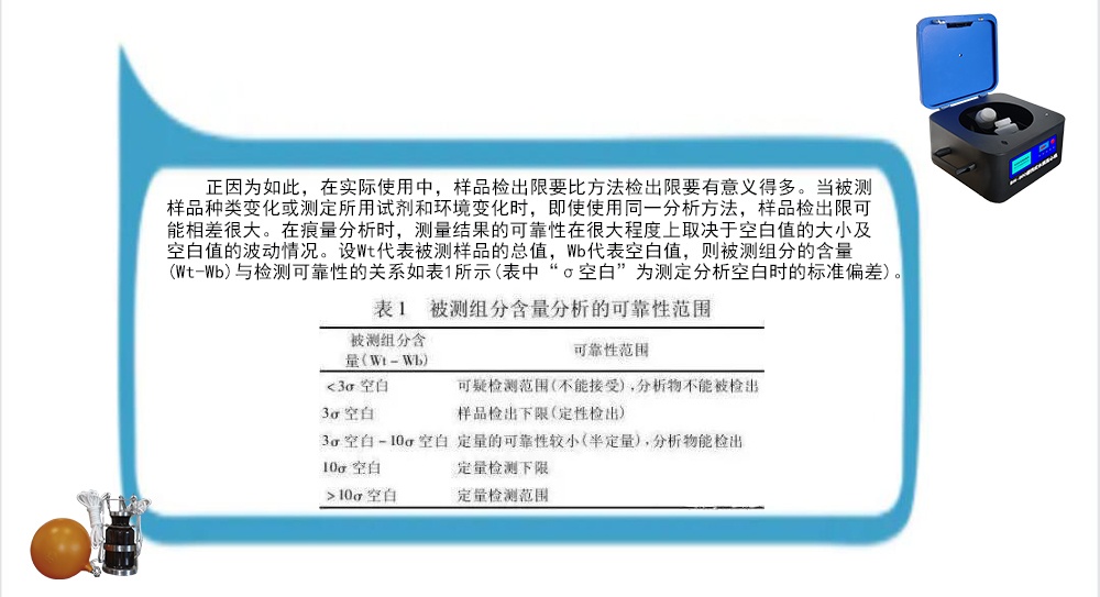 长期以来,各个领域的检测人员针对检出限概念、估算方法及在各个不同领域的应用都进行了大量的探讨。像分析仪器在测定过程中存在与噪音相区别的小信号检出问题,同时也存在着分析方法能可靠测定物质最低含量的界限问题,这两个概念有着本质的不同。