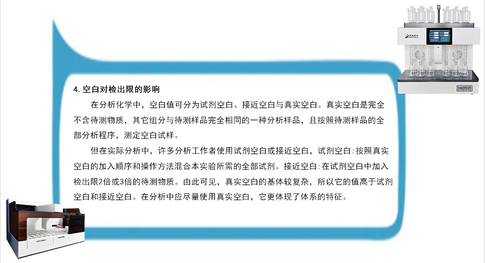 但在实际分析中,许多分析工作者使用试剂空白或接近空白,试剂空白:按照真实空白的加入顺序和操作方法混合本实验所需的全部试剂。接近空白:在试剂空白中加入检出限2倍或3倍的待测物质。由此可见,真实空白的基体较复杂,所以它的值高于试剂空白和接近空白。在分析中应尽量使用真实空白,它更体现了体系的特征。