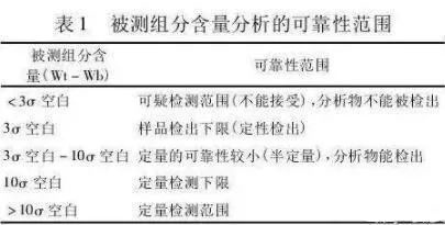 正因为如此,在实际使用中,样品检出限要比方法检出限要有意义得多。当被测样品种类变化或测定所用试剂和环境变化时,即使使用同一分析方法,样品检出限可能相差很大。在痕量分析时,测量结果的可靠性在很大程度上取决于空白值的大小及空白值的波动情况。设Wt代表被测样品的总值,Wb代表空白值,则被测组分的含量(Wt-Wb)与检测可靠性的关系如表1所示(表中“σ空白”为测定分析空白时的标准偏差)。