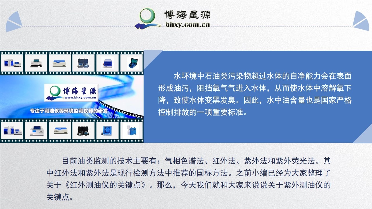 目前油类监测的技术主要有:气相色谱法、红外法、紫外法和紫外荧光法。其中红外法和紫外法是现行检测方法中推荐的国标方法。之前小编已经为大家整理了关于《红外测油仪的关键点》。那么,今天我们就和大家来说说关于紫外测油仪的关键点。