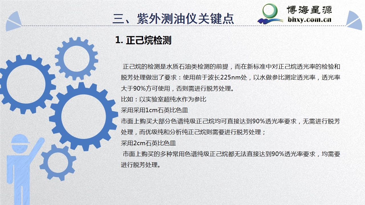 正己烷的检测是水质石油类检测的前提,而在新标准中对正己烷透光率的检验和脱芳处理做出了要求:使用前于波长225nm处,以水做参比测定透光率,透光率大于90%方可使用,否则需进行脱芳处理。