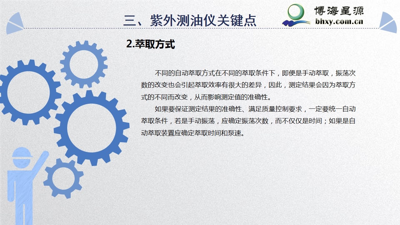 如果要保证测定结果的准确性、满足质量控制要求,一定要统一自动萃取条件,若是手动振荡,应确定振荡次数,而不仅仅是时间;如果是自动萃取装置应确定萃取时间和泵速。