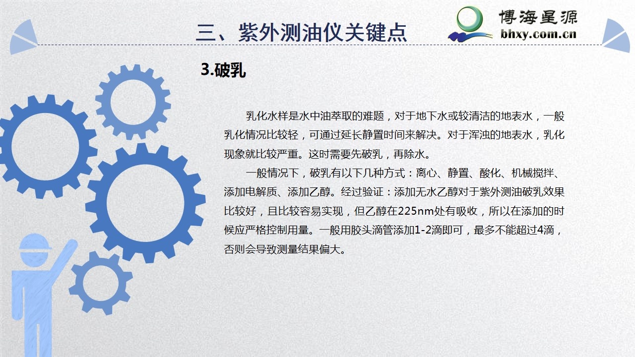 一般情况下,破乳有以下几种方式:离心、静置、酸化、机械搅拌、添加电解质、添加乙醇。经过验证:添加无水乙醇对于紫外测油破乳效果比较好,且比较容易实现,但乙醇在225nm处有吸收,所以在添加的时候应严格控制用量。一般用胶头滴管添加1-2滴即可,最多不能超过4滴,否则会导致测量结果偏大。