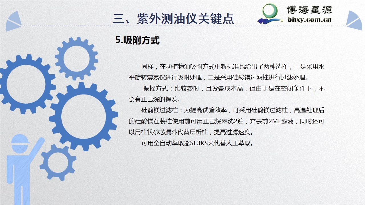 同样,在动植物油吸附方式中新标准也给出了两种选择,一是采用水平旋转震荡仪进行吸附处理,二是采用硅酸镁过滤柱进行过滤处理。