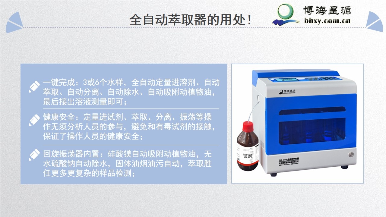 根据环保监测要求的日益提升,地表水石油类在线监测会越来越多地区的环保局所采纳,博海星源测油仪专业性强、测量精准、信号稳定、萃取率高、操作简单,为用户提供精准高效的分析工具。