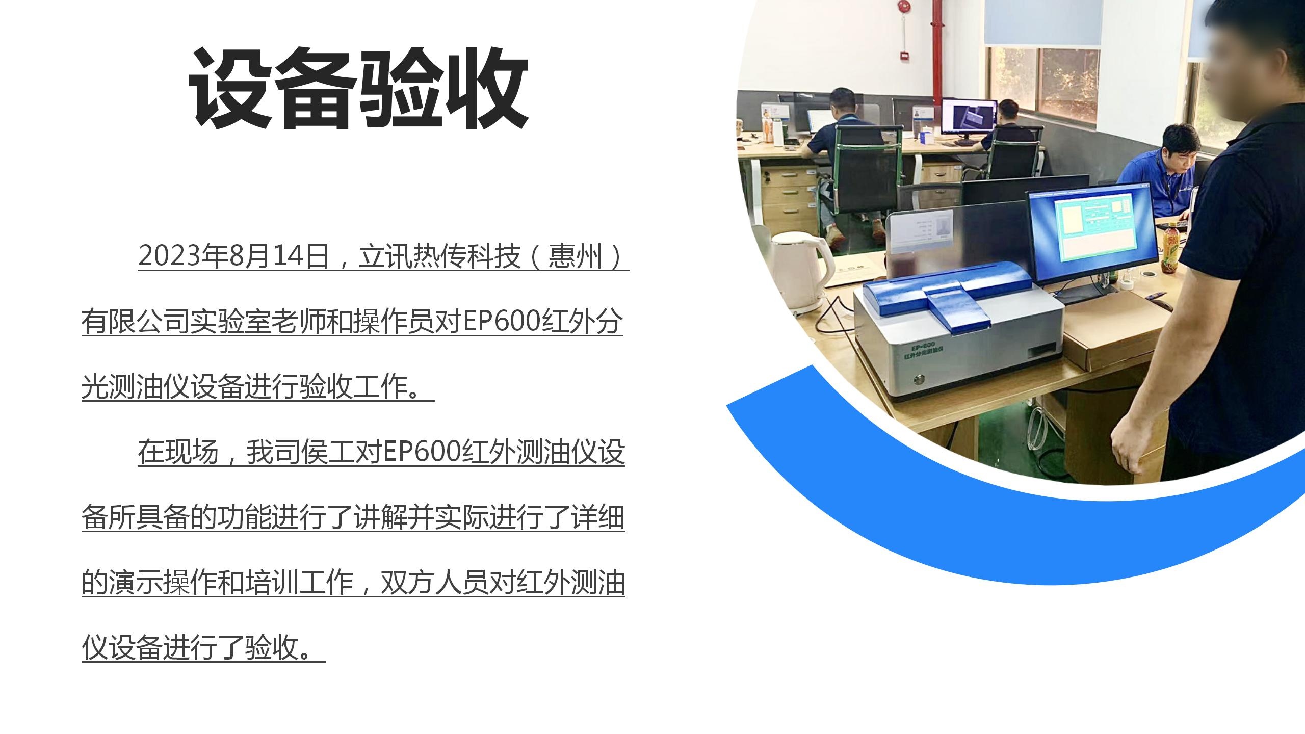 2023年8月14日,立讯热传科技(惠州)有限公司实验室老师和操作员对EP600红外分光测油仪设备进行验收工作。