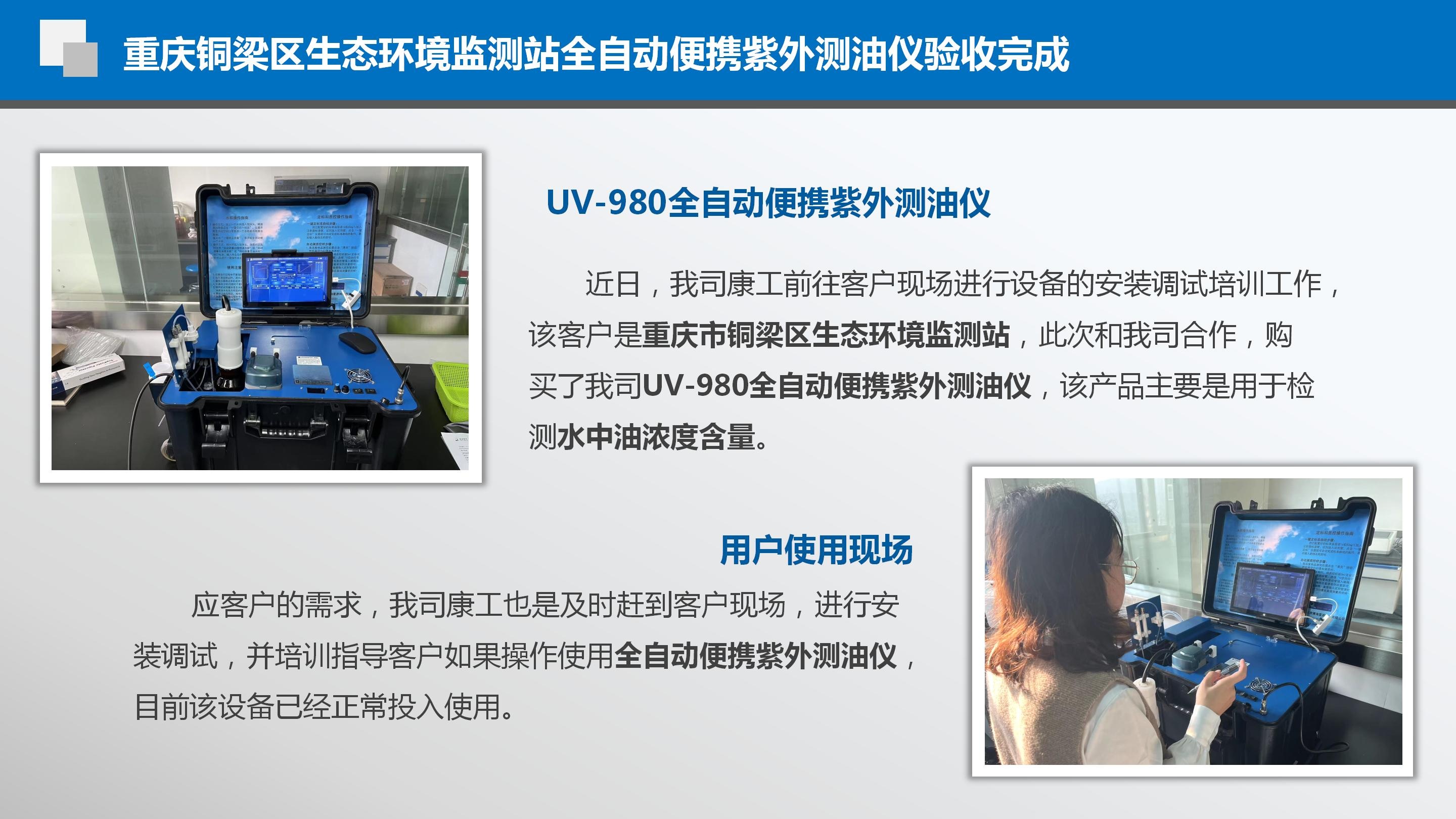 近日,我司康工前往客户现场进行设备的安装调试培训工作, 该客户是重庆市铜梁区生态环境监测站,此次和我司合作,购买了我司UV-980全自动便携紫外测油仪,该产品主要是用于检测水中油浓度含量。应客户的需求,我司康工也是及时赶到客户现场,进行安装调试,并培训指导客户如果操作使用全自动便携紫外测油仪,目前该设备已经正常投入使用。
