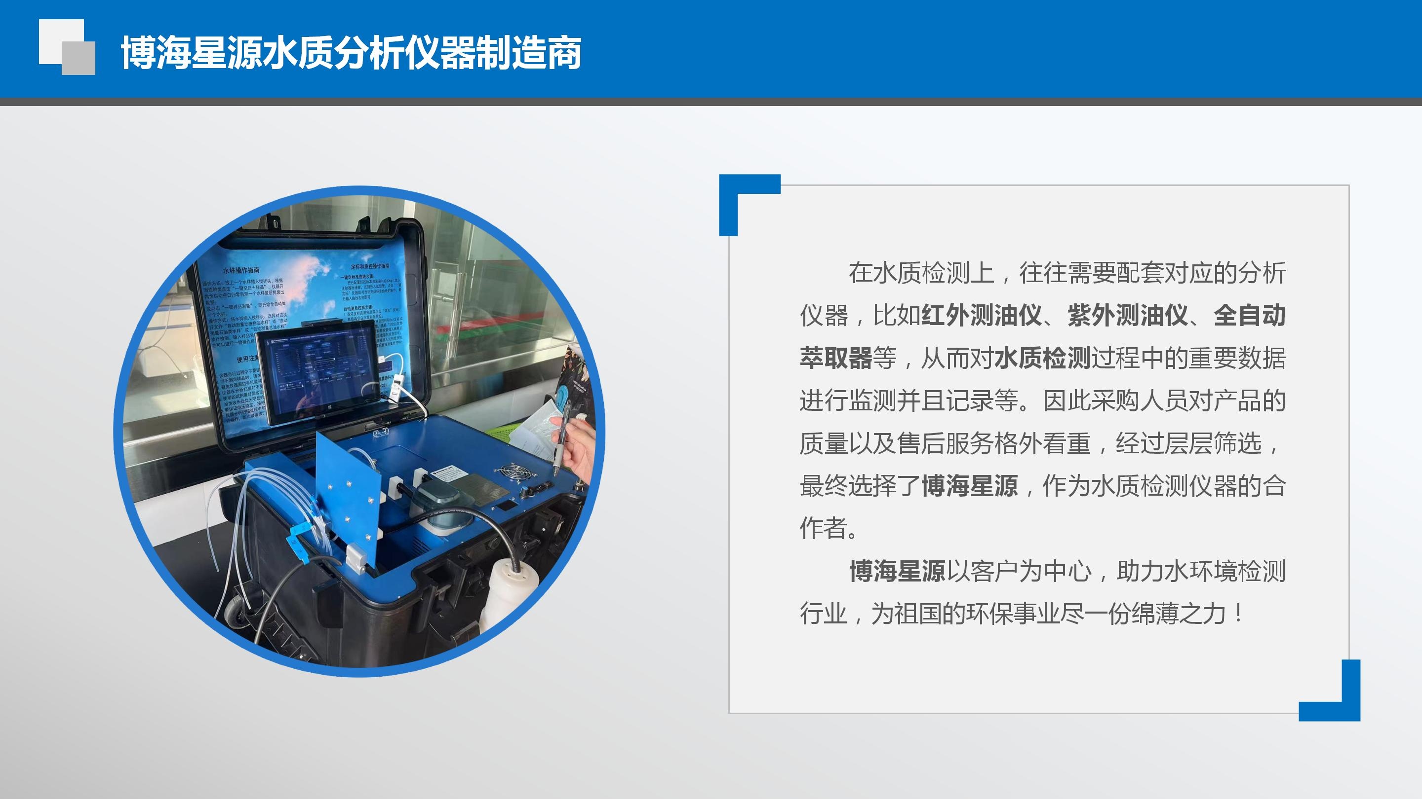 在水质检测上,往往需要配套对应的分析仪器,比如红外测油仪、紫外测油仪、全自动萃取器等,从而对水质检测过程中的重要数据进行监测并且记录等。因此采购人员对产品的质量以及售后服务格外看重,经过层层筛选,最终选择了博海星源,作为水质检测仪器的合作者。