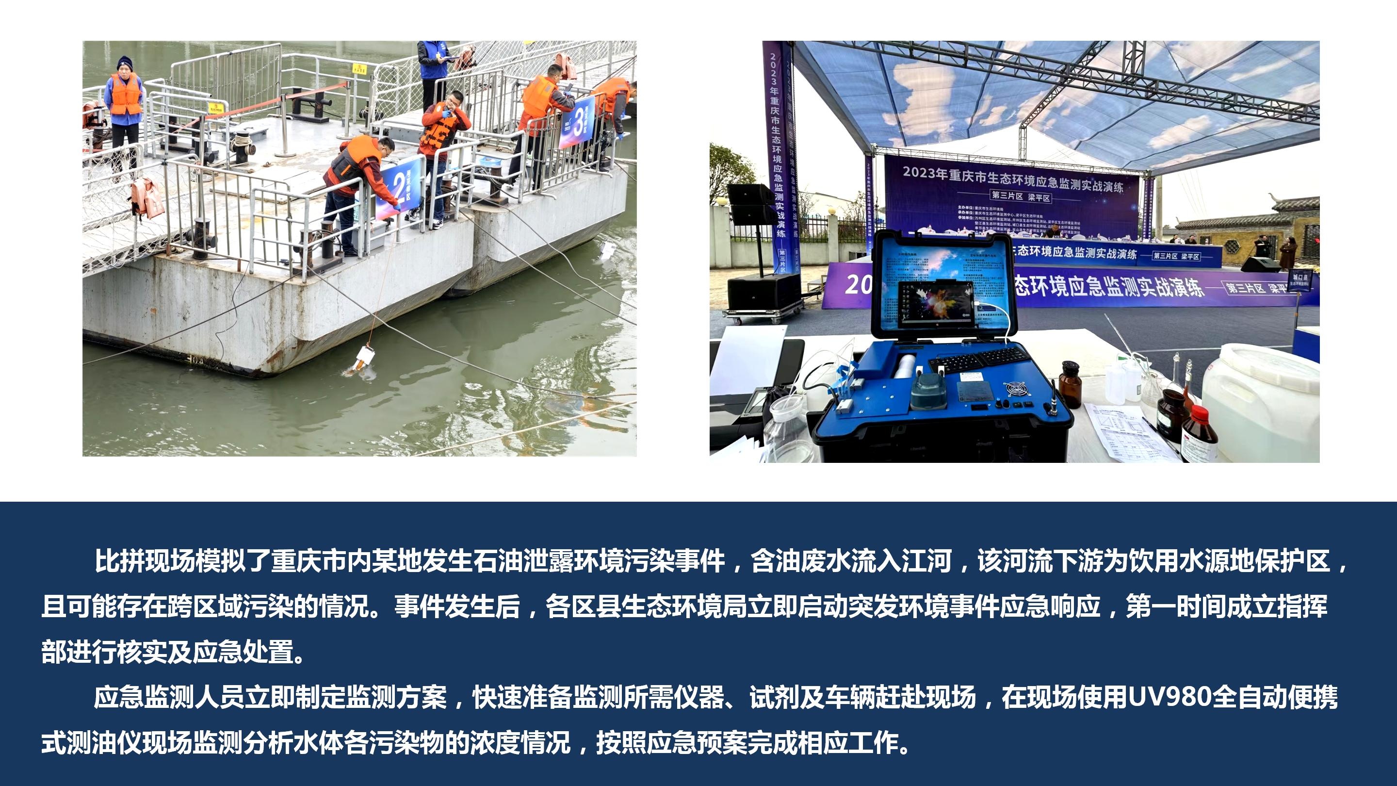 应急监测人员立即制定监测方案,快速准备监测所需仪器、试剂及车辆赶赴现场,在现场使用UV980全自动便携式测油仪现场监测分析水体各污染物的浓度情况,按照应急预案完成相应工作。