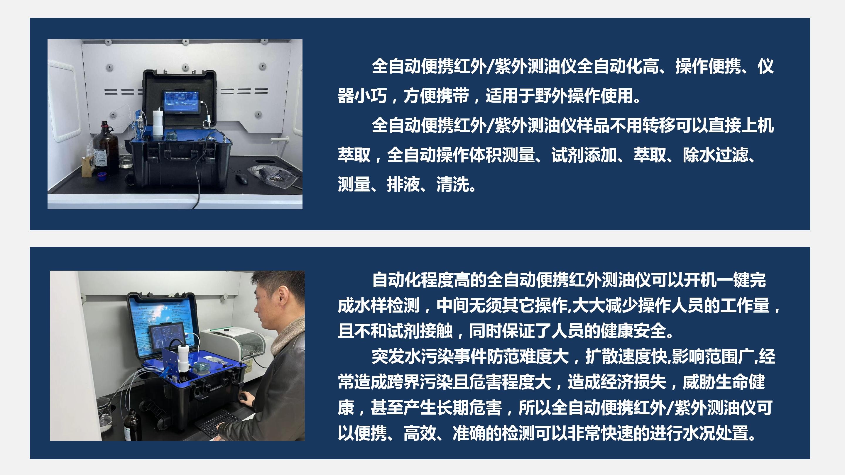 自动化程度高的全自动便携红外测油仪可以开机一键完成水样检测,中间无须其它操作,大大减少操作人员的工作量,且不和试剂接触,同时保证了人员的健康安全。
