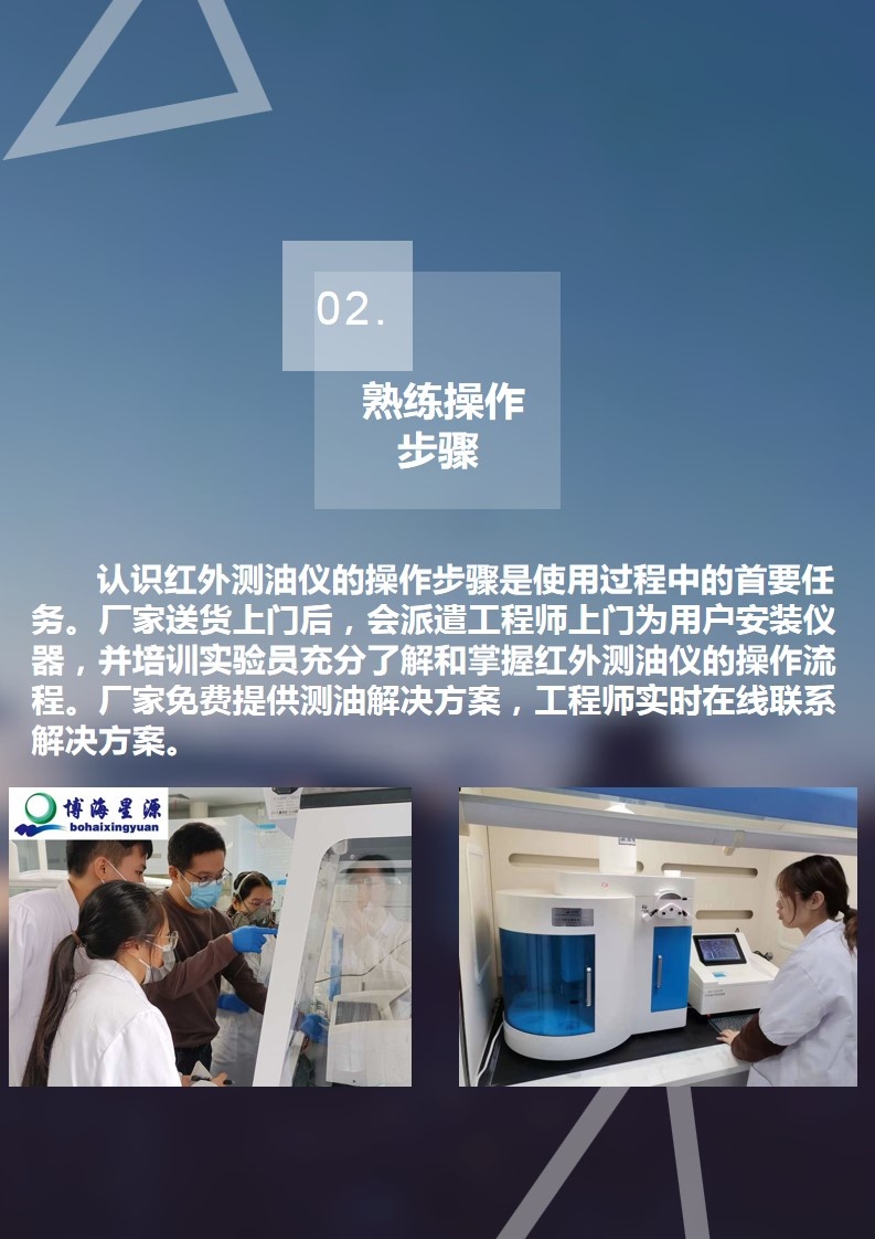 2. 熟练操作步骤:认识红外测油仪的操作步骤是使用过程中的首要任务。厂家送货上门后,会派遣工程师上门为用户安装仪器,并培训实验员充分了解和掌握红外测油仪的操作流程。厂家免费提供测油解决方案,工程师实时在线联系解决方案。