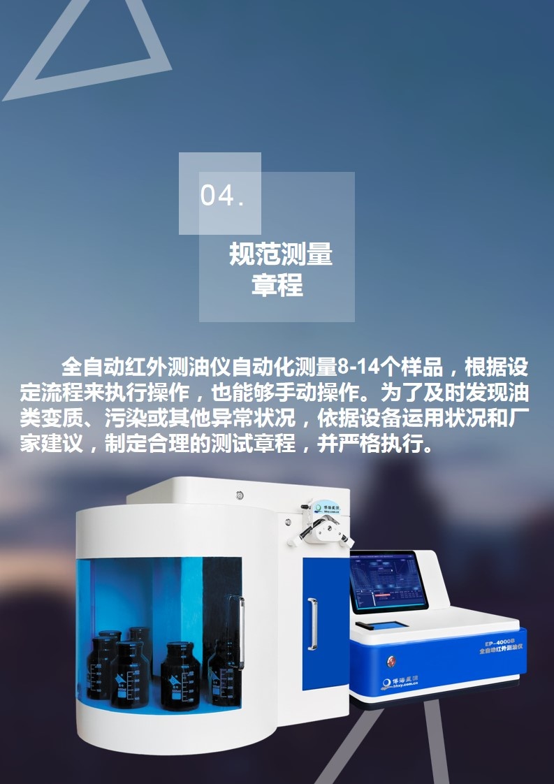 4. 规范测量章程:全自动红外测油仪自动化测量8-14个样品,根据设定流程来执行操作,也能够手动操作。为了及时发现油类变质、污染或其他异常状况,依据设备运用状况和厂家建议,制定合理的测试章程,并严格执行。