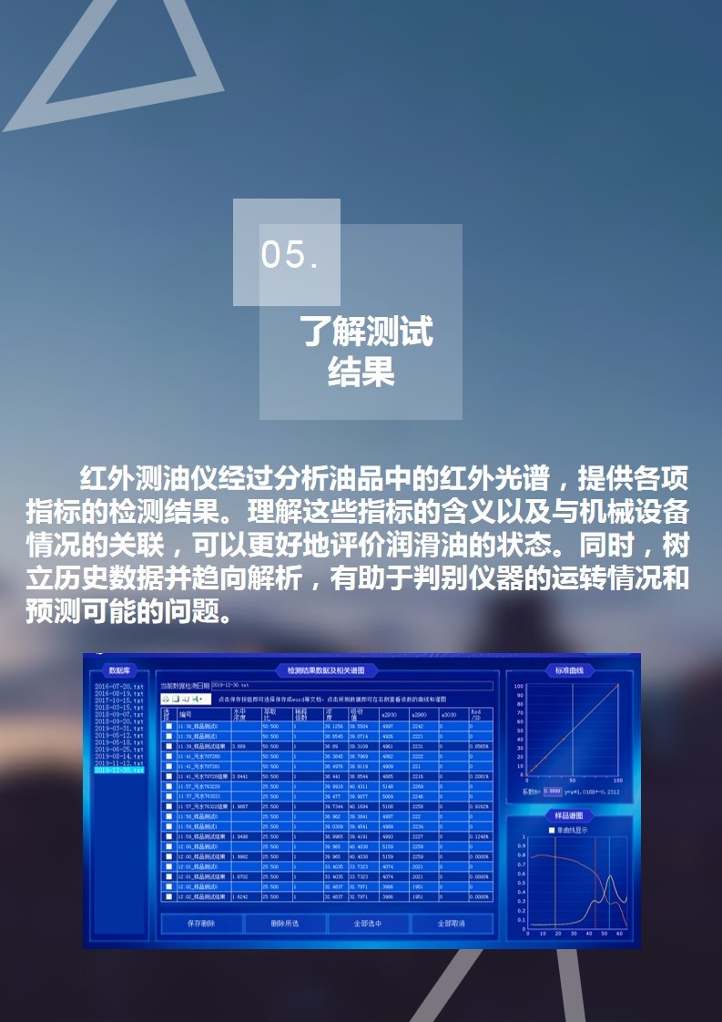 5. 了解测试结果:红外测油仪经过分析油品中的红外光谱,提供各项指标的检测结果。理解这些指标的含义以及与机械设备情况的关联,可以更好地评价润滑油的状态。同时,树立历史数据并趋向解析,有助于判别仪器的运转情况和预测可能的问题。