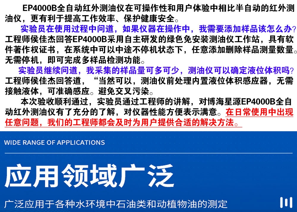 工程师侯佳杰回答EP4000B采用自主研发的绿色免安装测油仪工作站,具有软件著作权证书,在系统中可以中途不停机状态下,任意添加删除样品测量数量。无需停机,即可完成多样品检测功能。