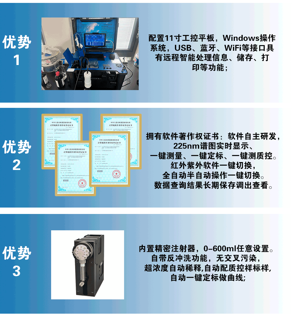 拥有软件著作权证书:软件自主研发,225nm谱图实时显示、一键测量、一键定标、一键测质控。红外紫外软件一键切换,全自动半自动操作一键切换。数据查询结果长期保存调出查看。