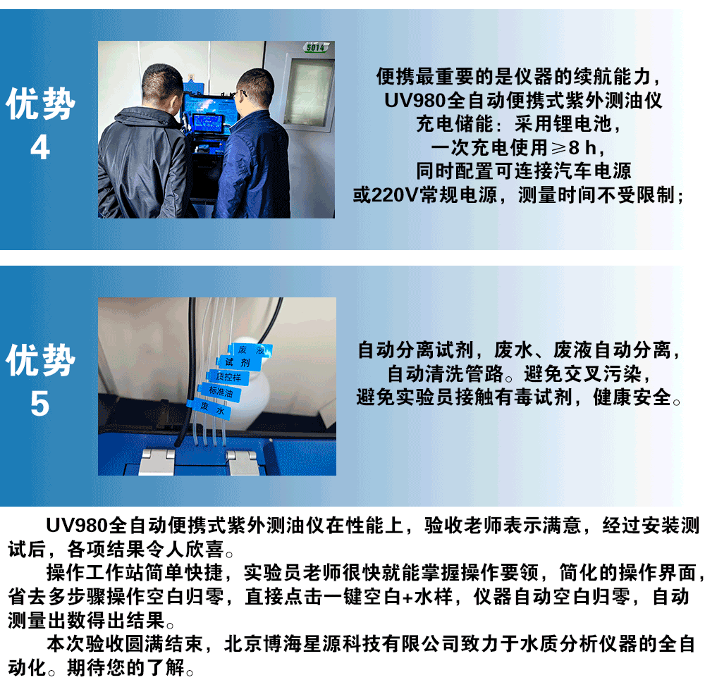 UV980全自动便携式紫外测油仪在性能上,验收老师表示满意,经过安装测试后,各项结果令人欣喜。