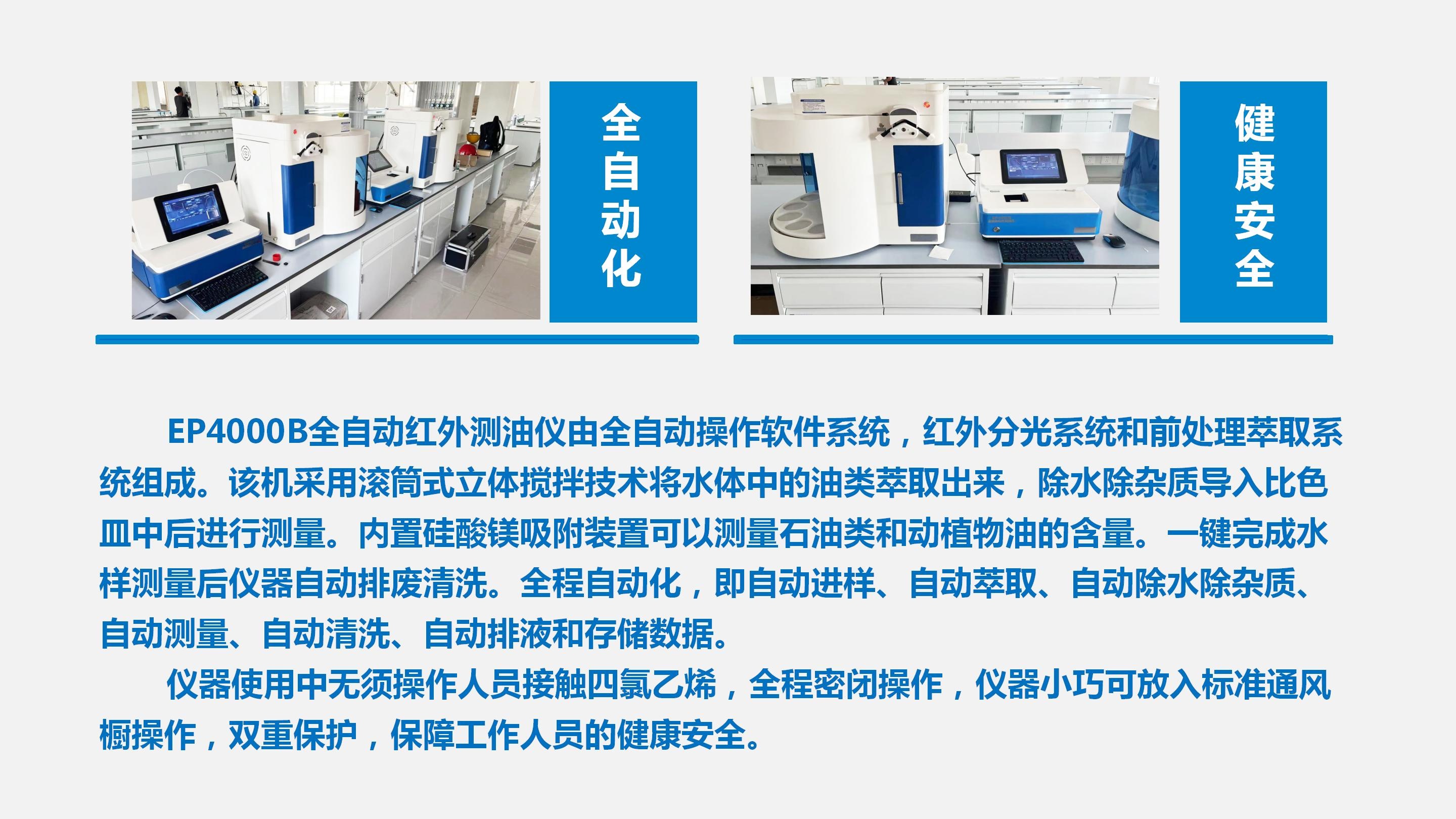 近日EP4000B全自动红外测油仪已正式投入使用,主要应用在生活污水、工业废水中含油量的测量。同时亦可测地表水、地下水中石油类的含量。