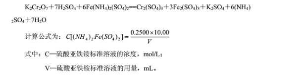 2. 反应结束后,剩余的重铬酸钾用硫酸亚铁铵标准溶液滴定,试亚铁灵为指示剂。溶液由黄色经蓝绿色至红褐色即为终点。反应式为:
