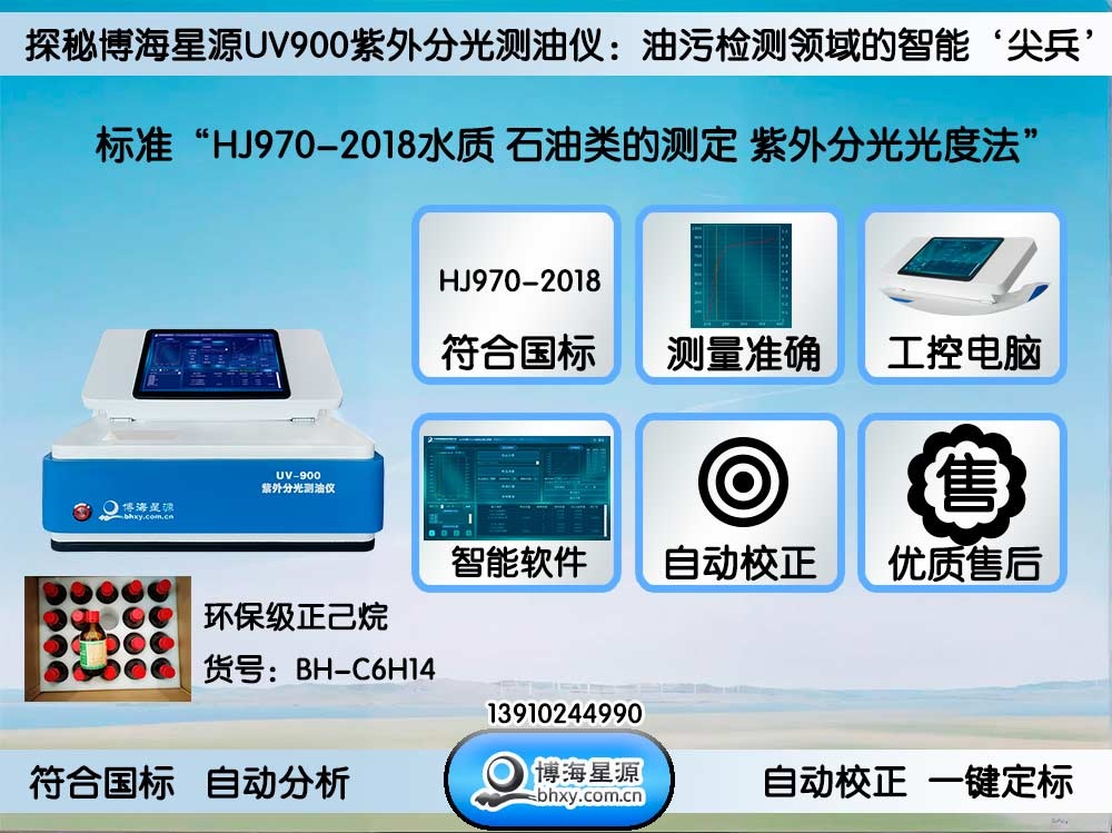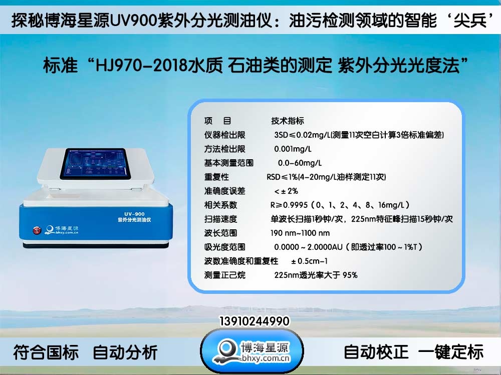 在含油量检测的领域,博海星源UV900紫外分光测油仪是测量地表水、地下水、海水等含油量的智能化分析仪器,根据国标法‘HJ970-2018’标准,准确的、快速的检测出石油类,成为当之无愧的智能“尖兵”。