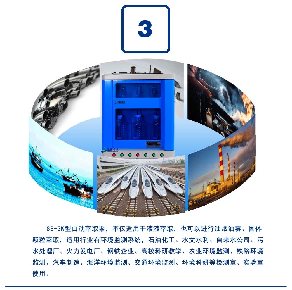 SE3K自动萃取器红外法该仪器为全自动工作方式,由萃取瓶、磁力搅拌、蠕动泵及控制部分组成。其工作原理是利用磁力搅拌将水样和萃取剂充分融合将油液分离,以达到萃取的目的。代替了人工摇晃,减轻了实验人员的劳动强度,避免了人与有毒试剂的直接接触,保护了操作人员的身体健康,整个萃取过程无须人工放气,可自动排液,自动清洗.同时,自动液液萃取装置还大大减少了对环境的污染,提高了萃取效率,使分析结果稳定可靠。 可广泛用于:水体中的油,挥发酚,阴离子等所有液液萃取工作。
