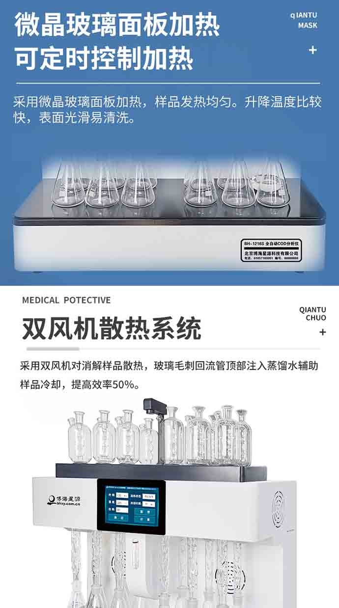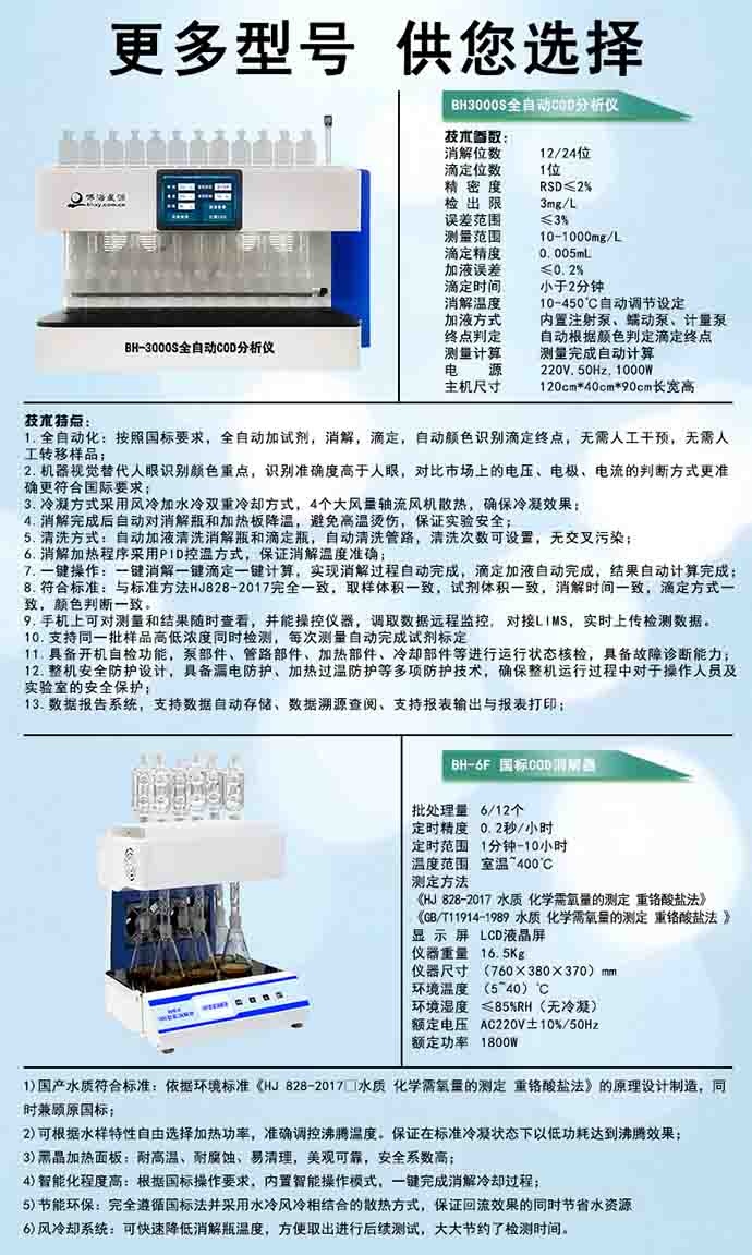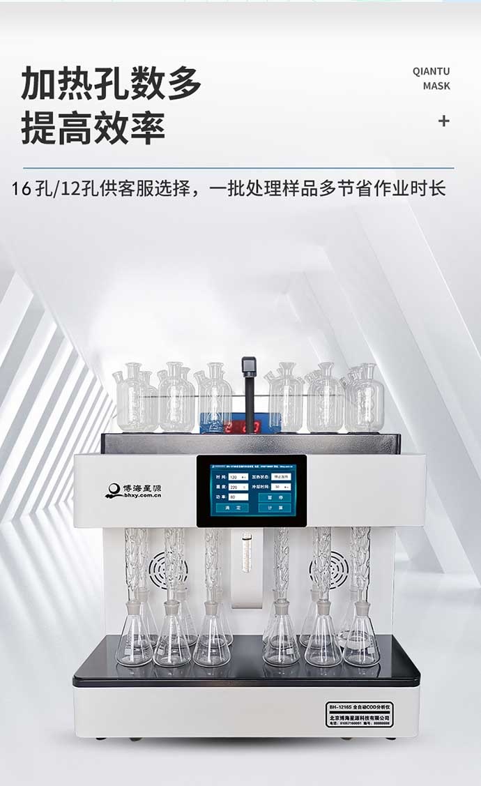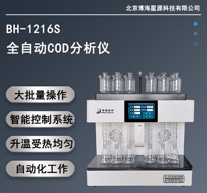 BH-1216S全自动COD分析仪是依据国标方法HJ828-2017化学需氧量重铬酸钾法的测定研发,采用8寸智能液晶触控屏设计,一键操作简洁方便,自动完成加液、消解、冷却、加水、滴定、计算CODcr,最后清洗。