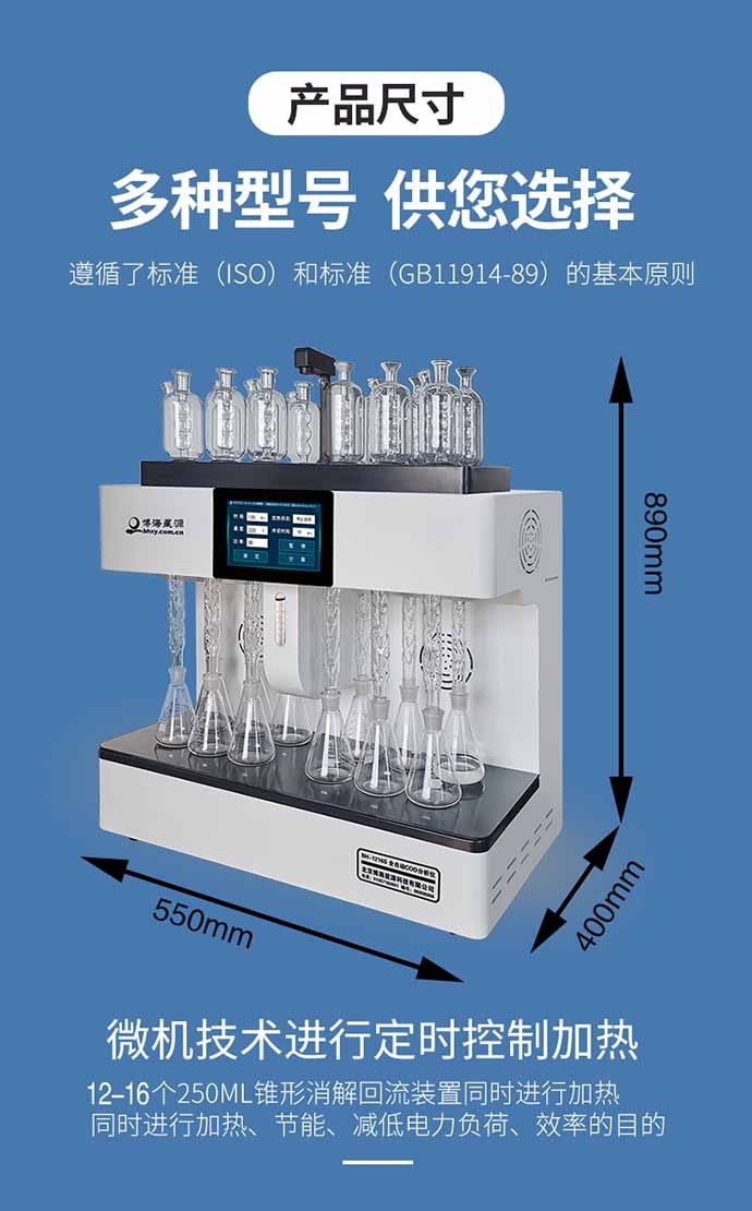 2. 仪器采用12/16位消解回流,耐酸碱耐腐蚀,加热均匀;