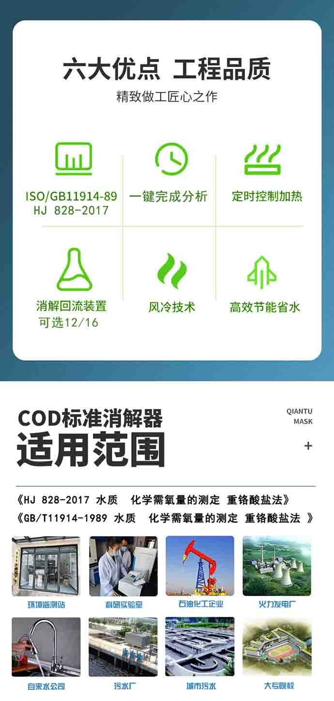该仪器广泛用于环保、医疗、卫生、食品、自来水、造纸、制药、污水处理、印染、石化、冶金、科研院校等行业的水质COD测定。