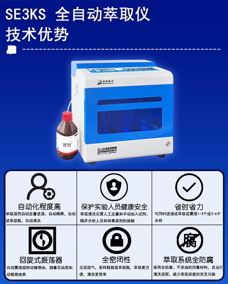 可配备SE-3KS全自动萃取器,实现全自动定量进液、萃取、分离脱水和振荡吸附动植物油,杜绝有毒试剂接触,保障操作人员的健康安全;
