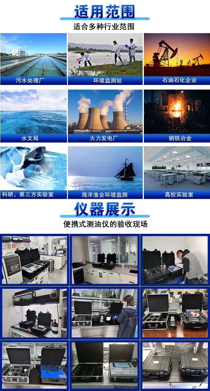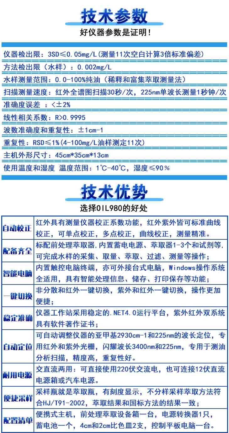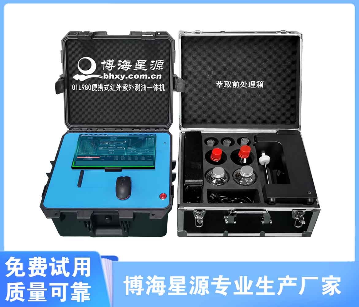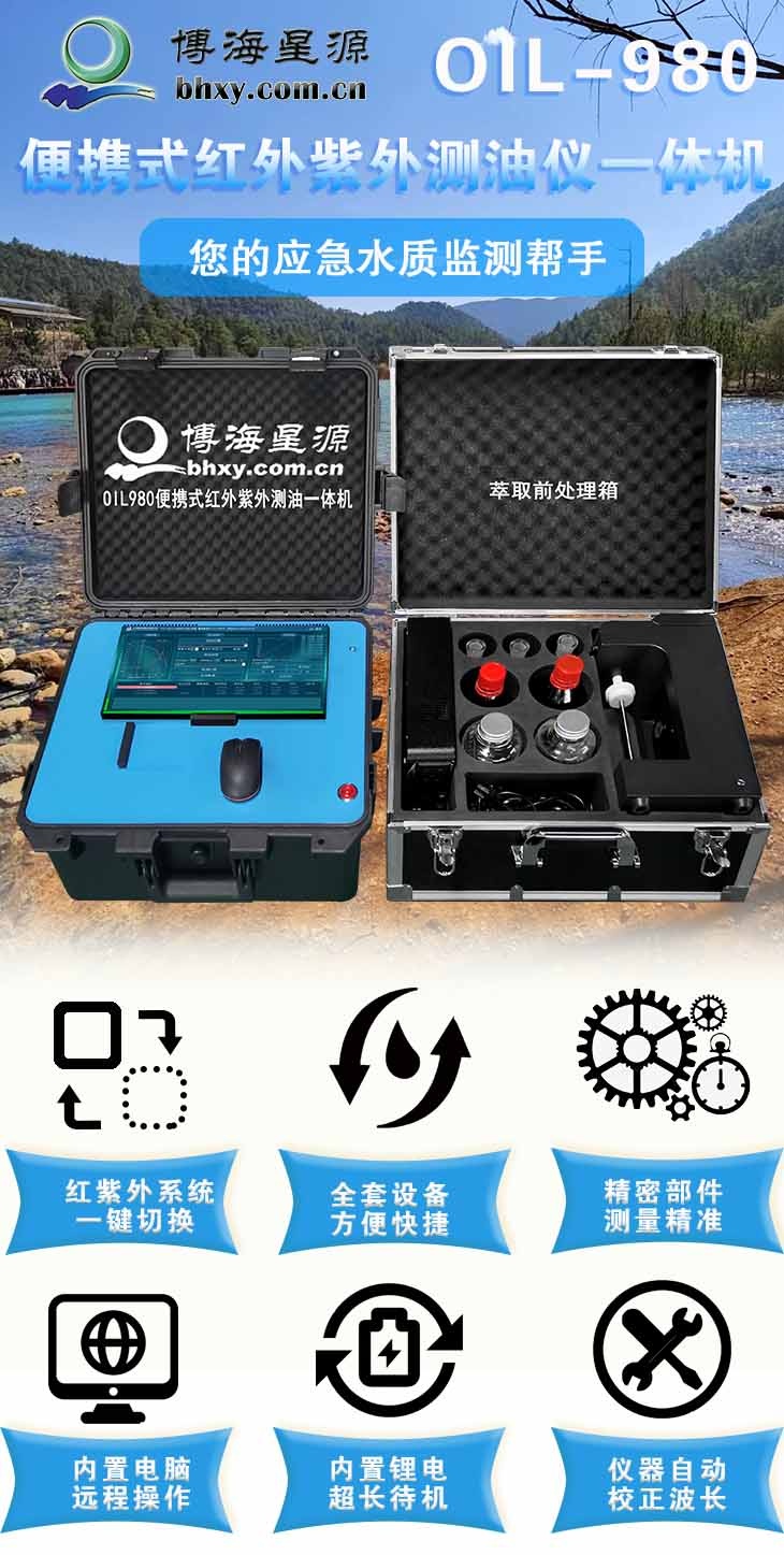 便携红外紫外测油仪一体机EU980适用于工业废水、生活污水和地表水、地下水的动植物油和石油类的检测分析。应用于环境检测,石油化工,水文水利,自来水公司,污水处理,高校科研教育等。