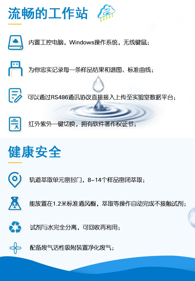 1. 全自动:进样、萃取、除水过滤、测量、排液、清洗,全自动可一次性萃取8-14个水样;