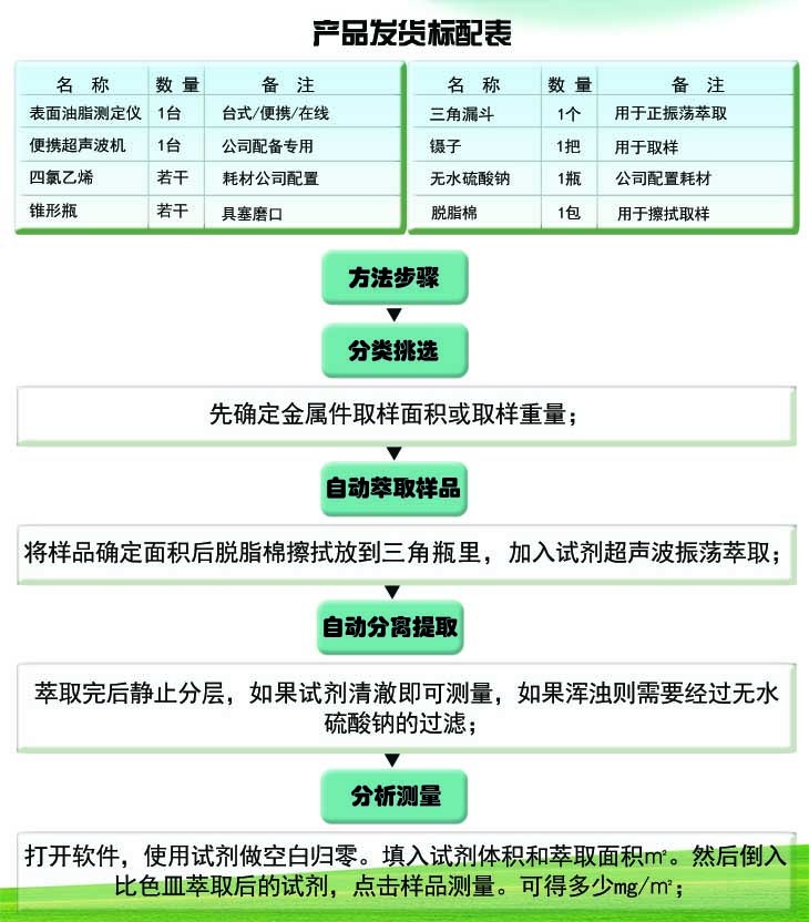 采用环保级试剂四氯乙烯或正己烷洗脱样品中的油类碳氢物质、总油类的含量由红外或紫外波数谱带处的吸光度吸收计算得出油含量结果,达到精密分析。